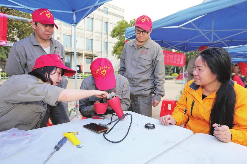 “小伙子,這個(gè)電烤箱壞了,你看能修好嗎?”“沒(méi)問(wèn)題,我?guī)湍愣ā!薄斑@些相片可以幫我過(guò)塑嗎?”“可以,馬上就給您過(guò)塑”……上午9時(shí)許,活動(dòng)剛剛開始,廣場(chǎng)上就聚集了許多群眾,面對(duì)群眾的每一個(gè)困難或疑問(wèn),志愿者都熱情解答,并一一動(dòng)手解決。